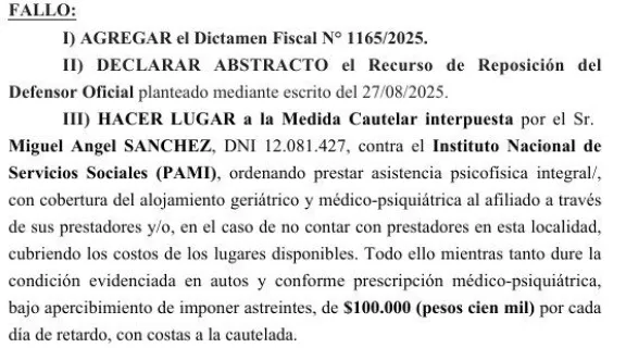 “Hacer lugar a la medida cautelar interpuesta contra el PAMI ordenando prestar asistencia psicofísica integral/, con cobertura del alojamiento geriátrico y médico-psiquiátrica al afiliado a través de sus prestadores y/o, en el caso de no contar con prestadores en esta localidad, cubriendo los costos de los lugares disponibles”, cita el fallo.