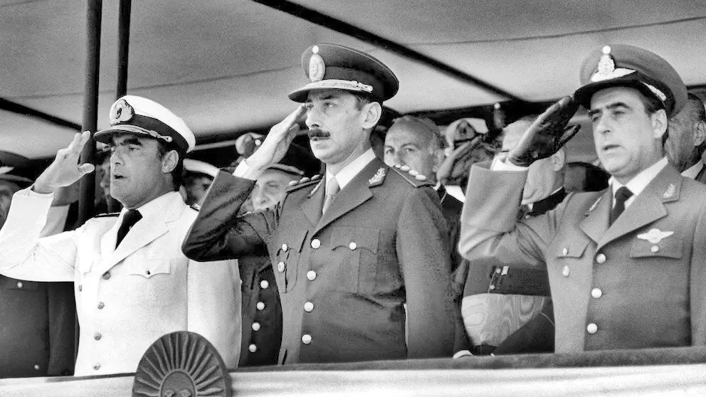 Massera junto al primer presidente de facto, el general Videla, y a Agosti. Se produjeron en esa época miles de asesinatos, torturas, secuestros, detenciones y desapariciones de personas.